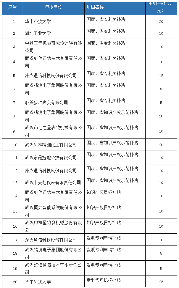 本次資金撥付對(duì)象為獲得洪山區(qū)2018年度洪山區(qū)知識(shí)產(chǎn)權(quán)項(xiàng)目資金的企業(yè),名單及資助金額見附件。
